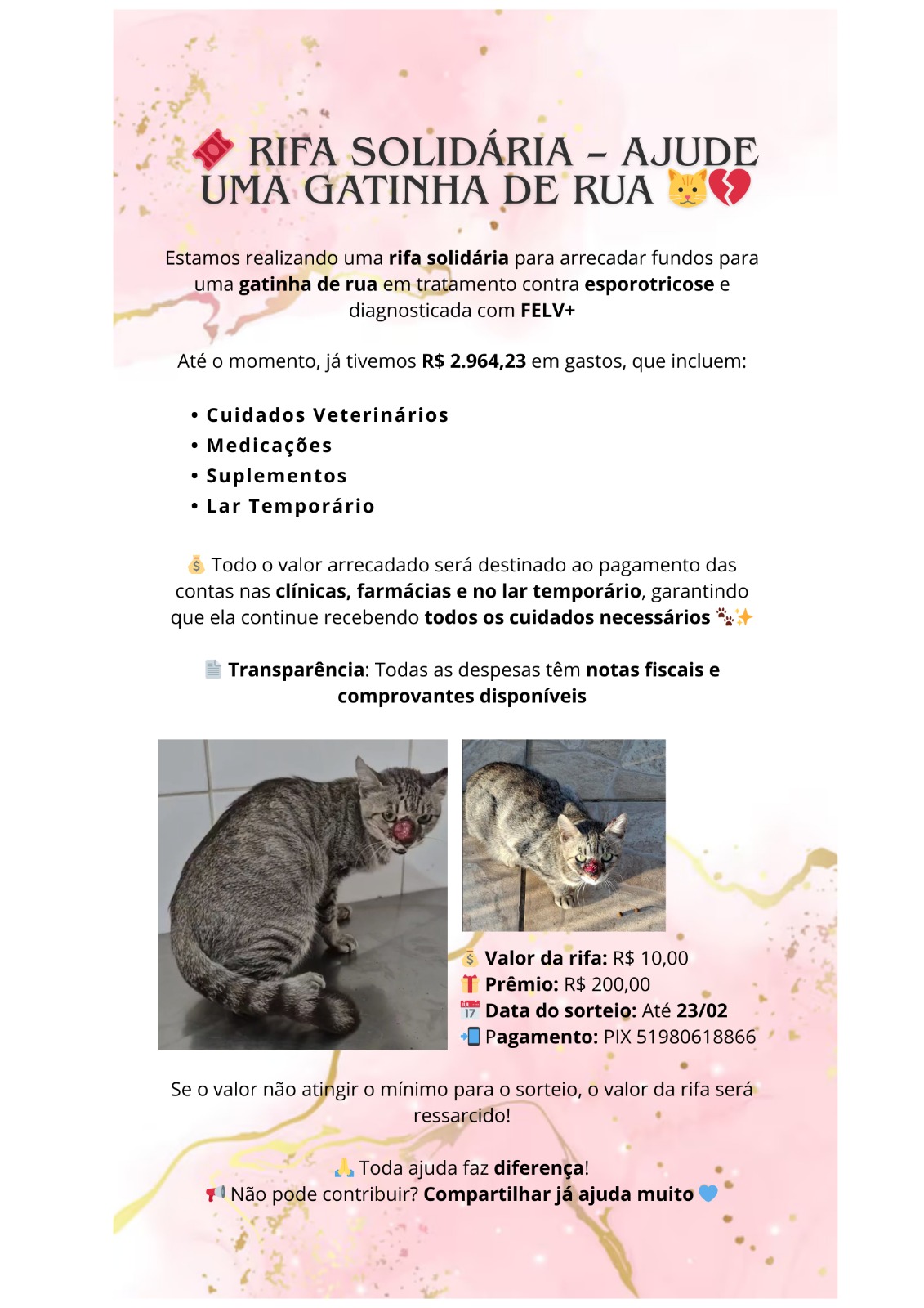Estamos realizando uma rifa solidária para arrecadar fundos para uma gatinha de rua em tratamento contra esporotricose e diagnosticada com felv+.até o momento, já tivemos r$ 2.964,23 em gastos, que incluem: • cuidados veterinários• medicações• suplementos• lar temporário💰 todo o valor arrecadado será destinado ao pagamento das contas nas clínicas, farmácias e no lar temporário, garantindo que ela continue recebendo todos os cuidados necessários 🐾✨📄 transparência: todas as despesas têm notas fiscais e comprovantes disponíveis.💰 valor da rifa: r$ 10,00🎁 prêmio: r$ 200,00📅 data do sorteio: até 23/02se o valor não atingir o mínimo para o sorteio, o valor da rifa será ressarcido!🙏 toda ajuda faz diferença!📢 não pode contribuir? compartilhar já ajuda muito 💙