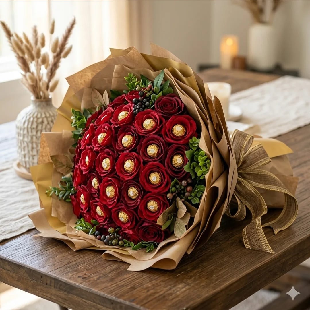 🥇 1º prêmio: Buquê de "Flores Comestíveis" (feito com 31 bombons Ferrero Rocher)