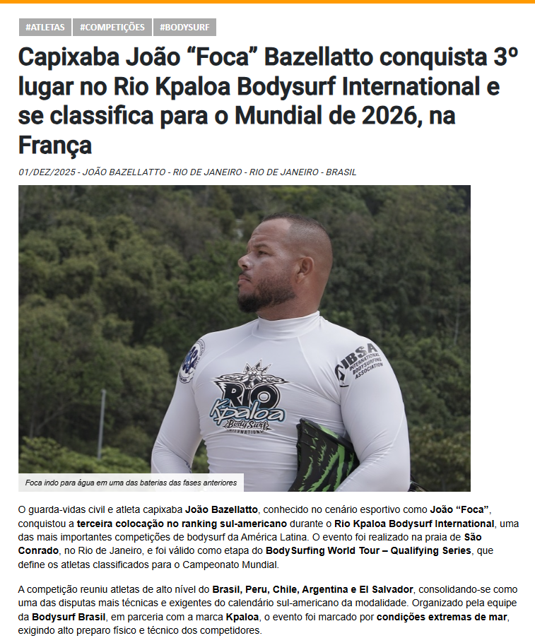 Fala, pessoal! Como muitos sabem, sou o João "Foca", atleta profissional de Bodysurf, Bicampeão Brasileiro e 3º colocado no Sul-Americano. Fui classificado para o Campeonato Mundial na França, que acontece entre setembro e outubro de 2026.
