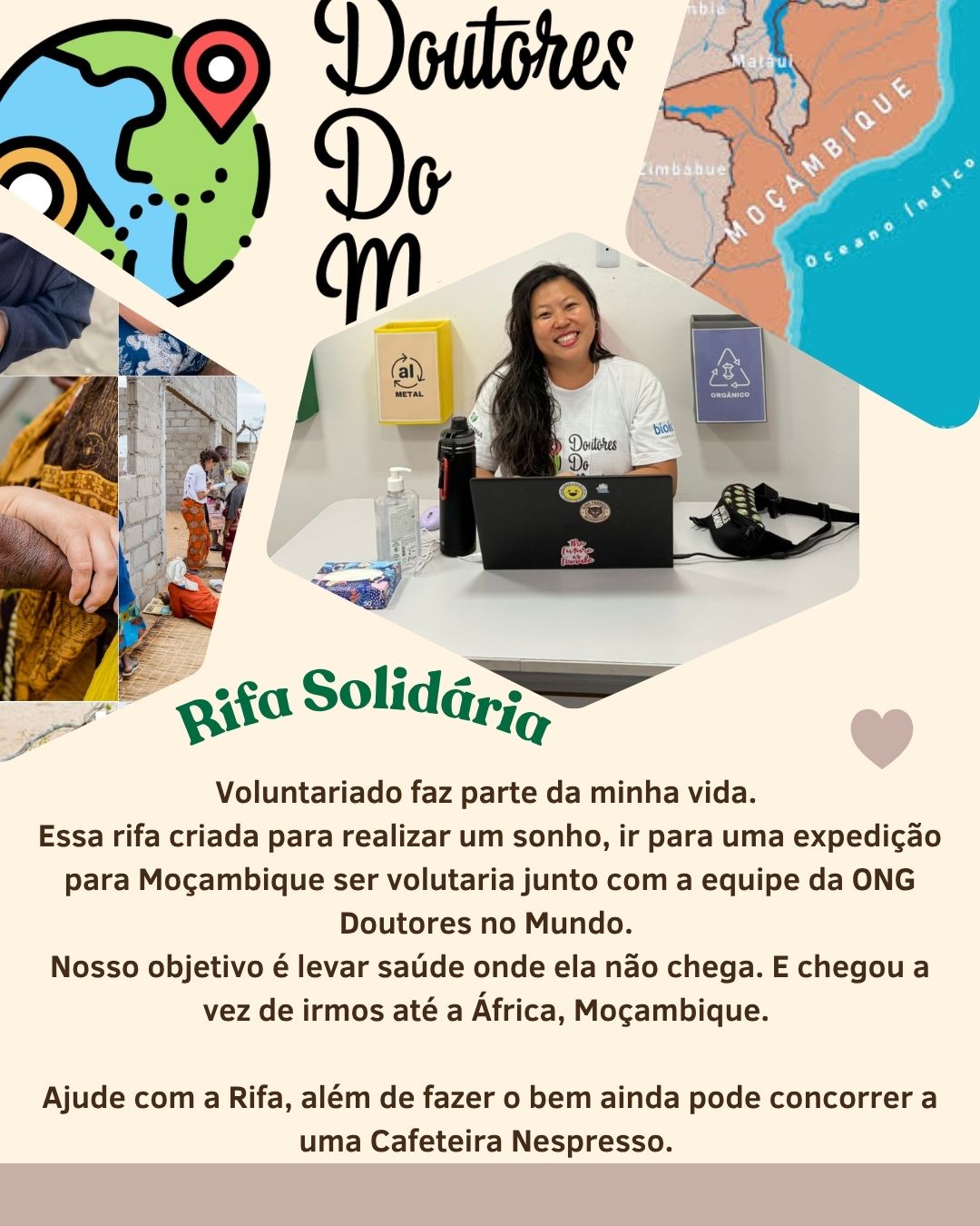 Essa rifa criada para realizar um sonho, ir para uma expedição para Moçambique ser volutaria junto com a equipe da ONG Doutores no Mundo.