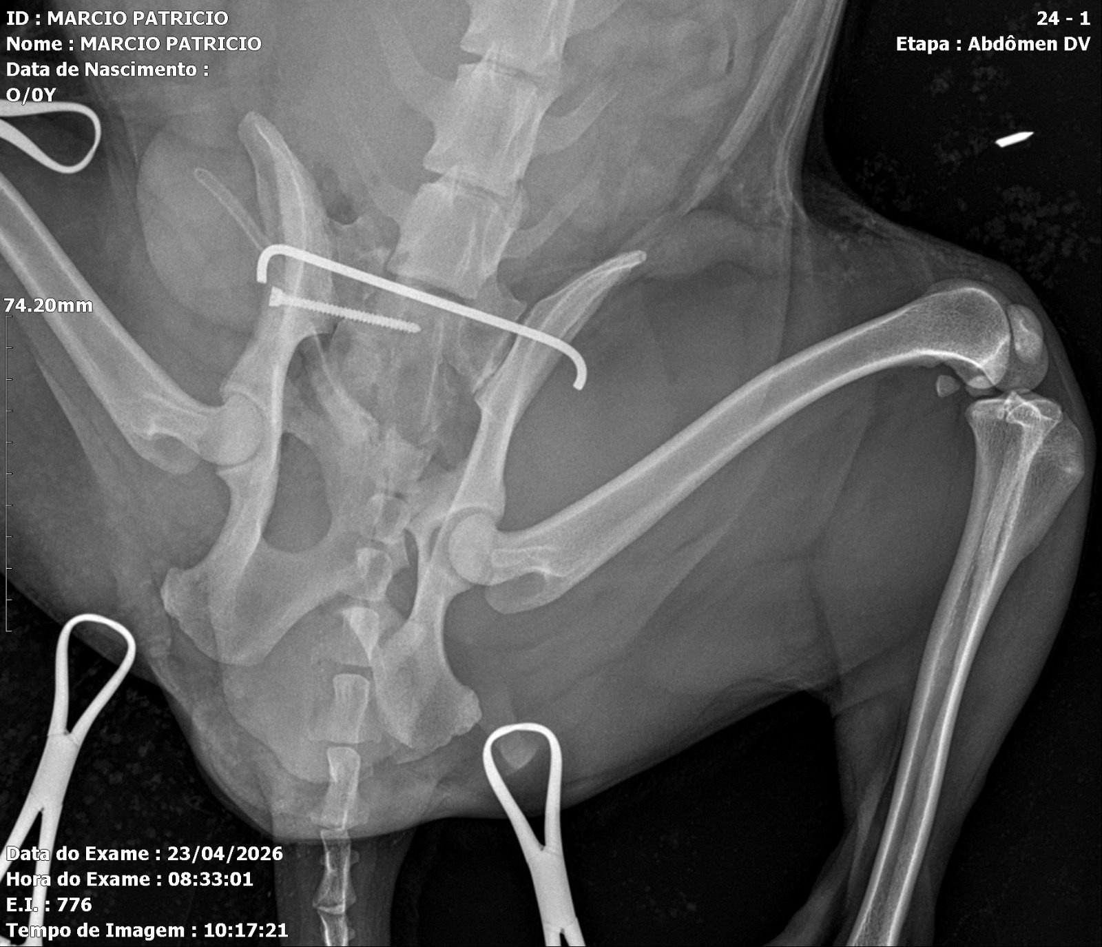 Ele foi atropelado por um carro no dia 21/04/26 e precisou passar por cirurgia de emergência para reconstrução da região da bacia, com colocação de prótese metálica.