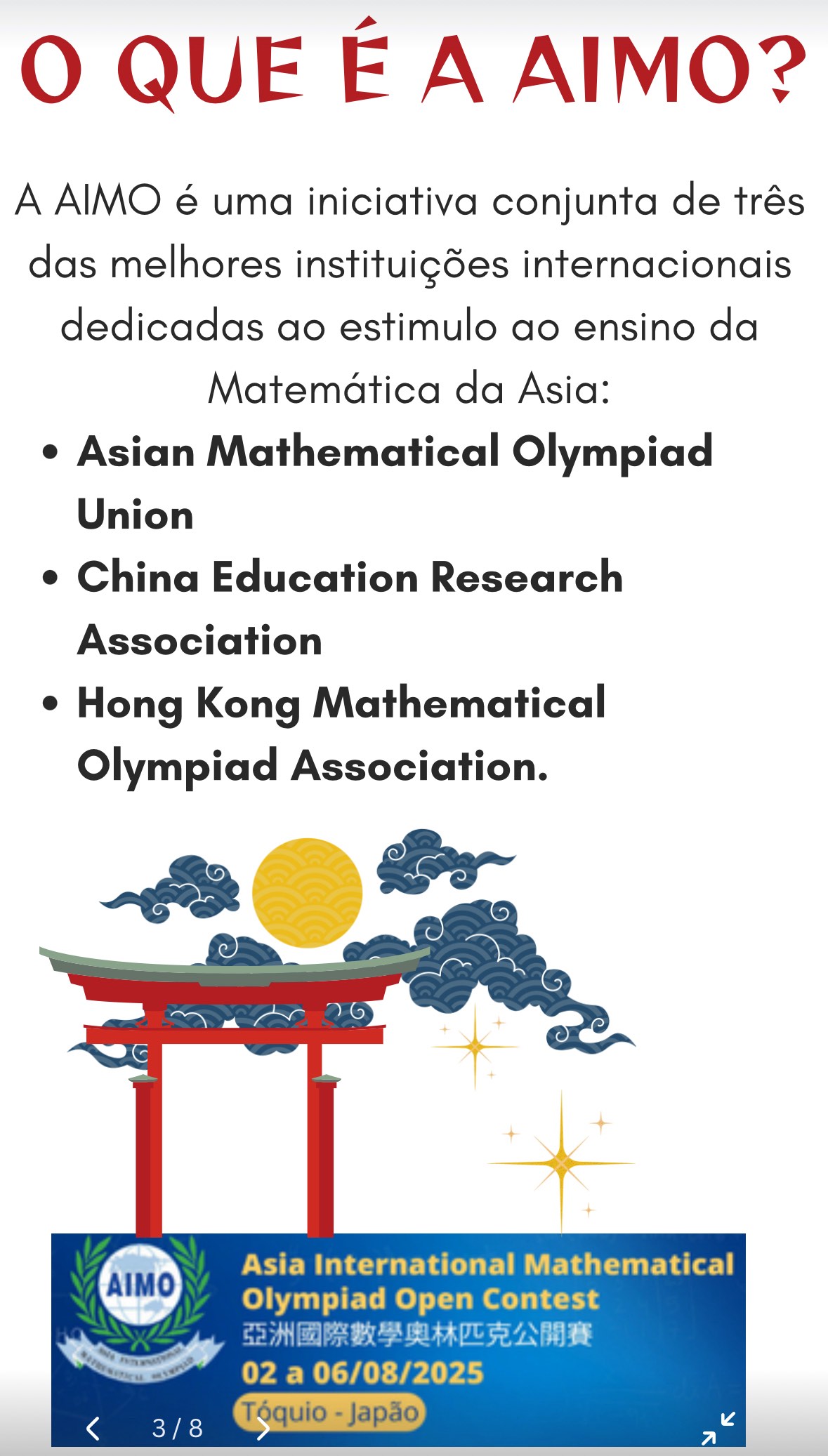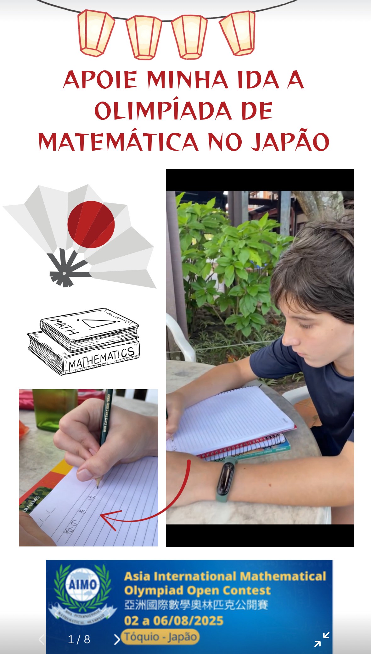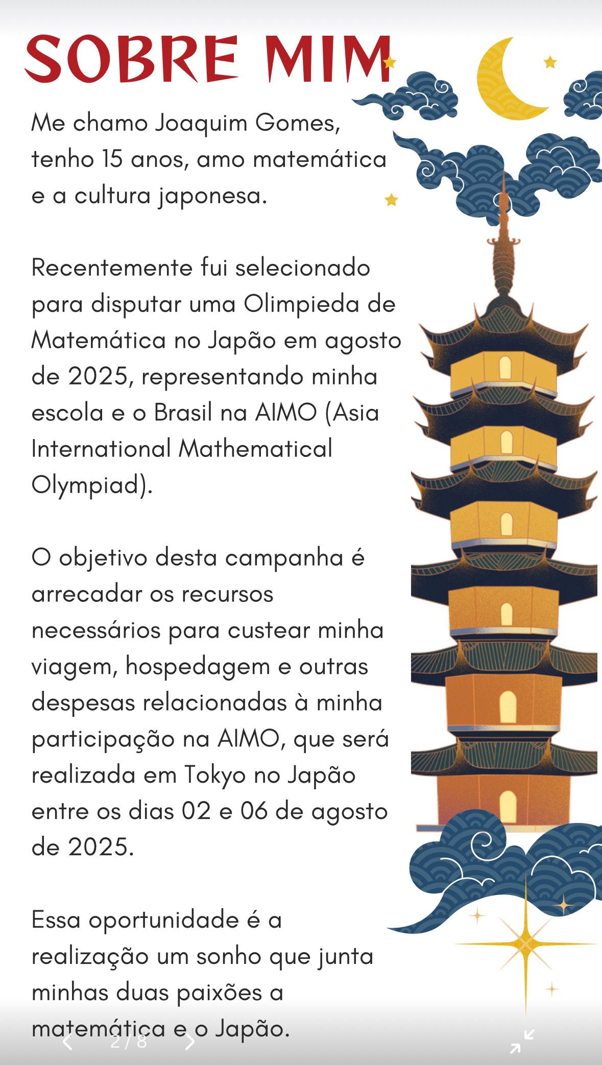 O objetivo desta campanha é arrecadar os recursos necessários para custear minha viagem, hospedagem e outras despesas relacionadas à participação na AIMO, que será realizada em Tóquio, entre os dias 2 e 6 de agosto de 2025. Essa é uma oportunidade que representa a realização de um sonho, pois une minhas duas paixões: matemática e o Japão. Agradeço muito pelo apoio e pela ajuda nesta aventura!