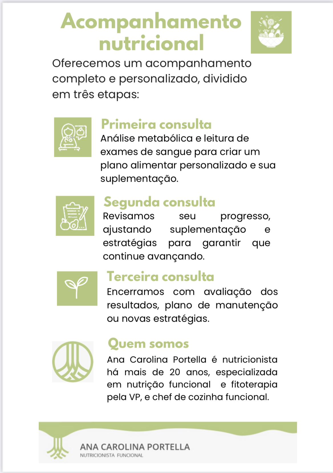 1° - acompanhamento com nutricionista; 2° - 1 foto fineart; 3° - 2 dias de cardápio cozinha da gente