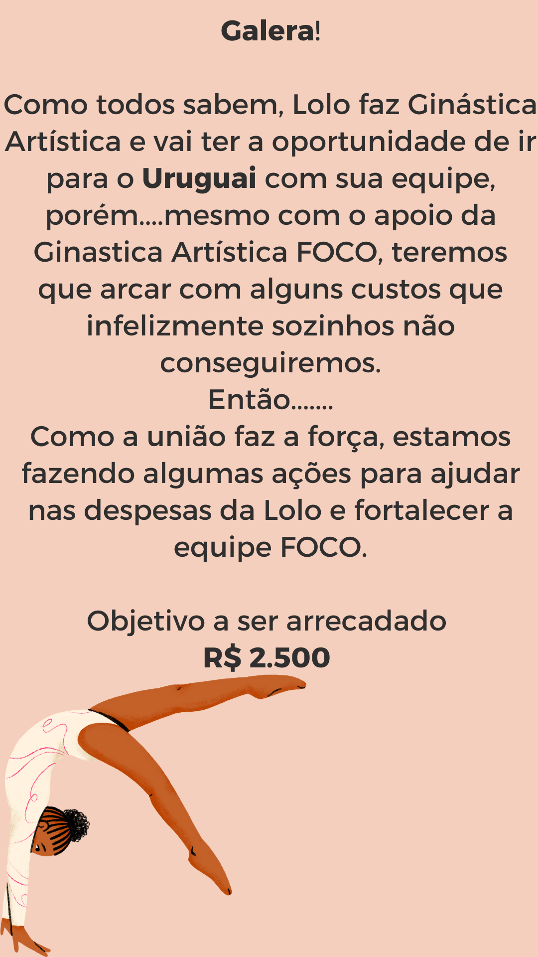 Como todos sabem, Lolo faz Ginástica Artística e vai ter a oportunidade de ir para o Uruguai com sua equipe, porém....mesmo com o apoio da Ginastica Artística FOCO, teremos que arcar com alguns custos que infelizmente sozinhos não conseguiremos.