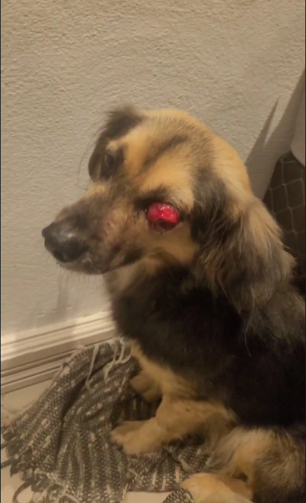 Não sabemos se ele foi acertado por um golpe ou atropelado, ele apareceu com o olho deste jeito e precisamos pagar a cirurgia dele para tentar recuperar a visão dele e amenizar o sofrimento.