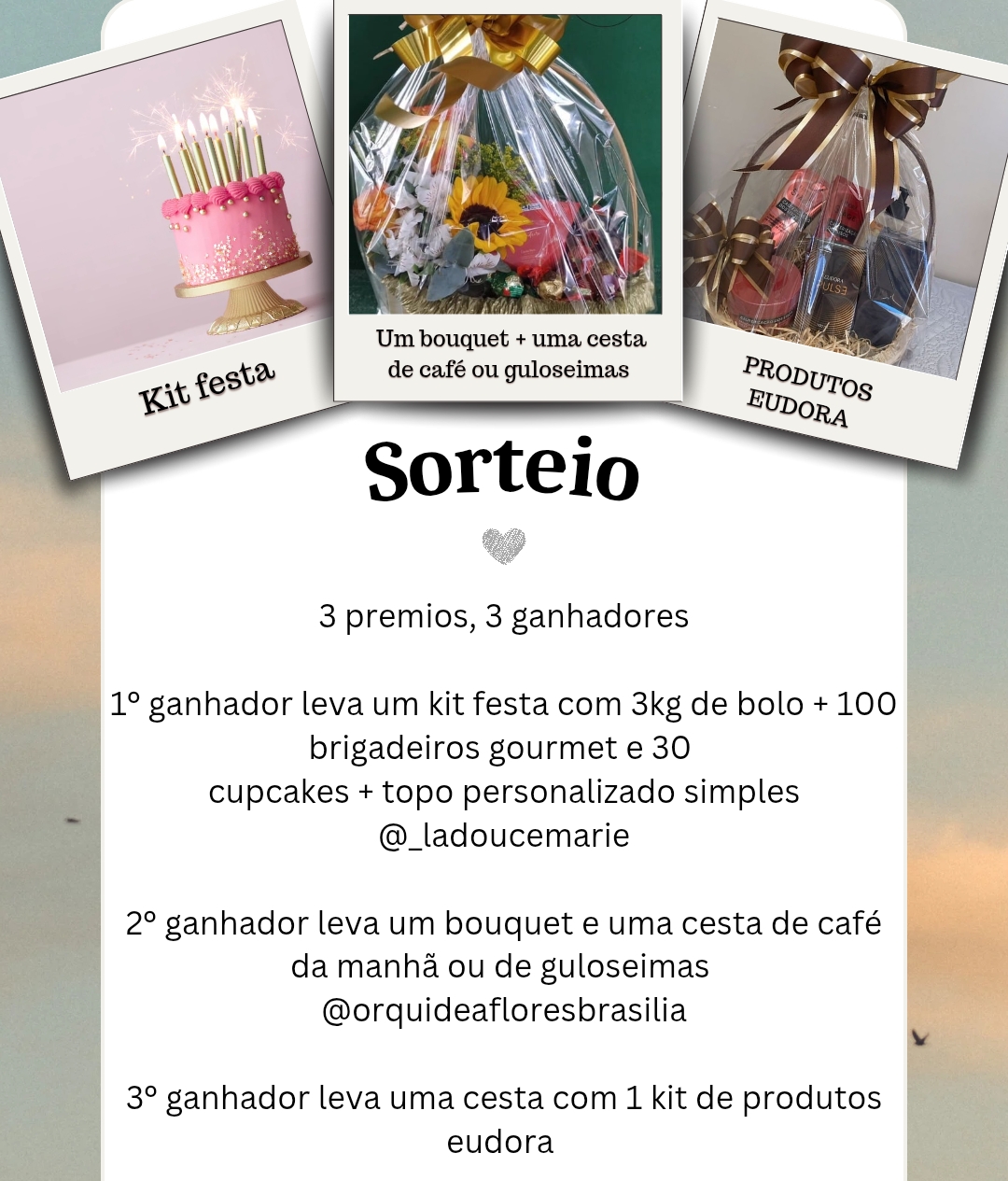 3 ganhadores 1 kit festa + 1 cesta de guloseimas ou café da manhã com 1 bouquet + 1 kit produtos eudora
