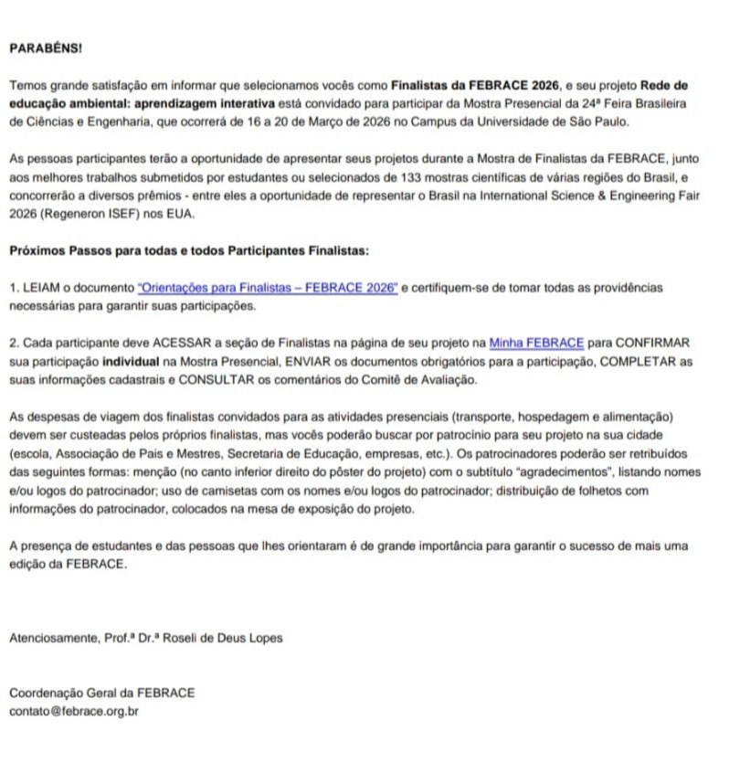 Ajude os alunos da escola lobo d’ almada a chegarem à maior feira de ciências do brasil!olá! fomos selecionados para participar na febrace (feira brasileira de ciências e engenharia) na usp, em são paulo! o nosso projeto, "rede de educação ambiental: aprendizagem interativa", utiliza reportagens e jogos pedagógicos para ensinar sobre a preservação do meio ambiente.representar boa vista neste evento nacional é um sonho, mas precisamos de ajuda para custear a nossa viagem (transporte, alimentação e estadia). por isso, criamos esta rifa solidária!prêmios: • 1 voucher para o cursinho da sala de redação da prof.ª gracinara • 4 prémios de r$ 150,00 via pixdata do sorteio: quarta-feira, 22 de abril de 2026cada bilhete é um passo a mais em direção a são paulo. a ciência e a educação transformam vidas, e com a sua ajuda, vamos mostrar que em roraima também se faz ciência de qualidade!dúvidas? entre em contato: whatsapp: (95) 98114-9515 ou (95) 9140-5317